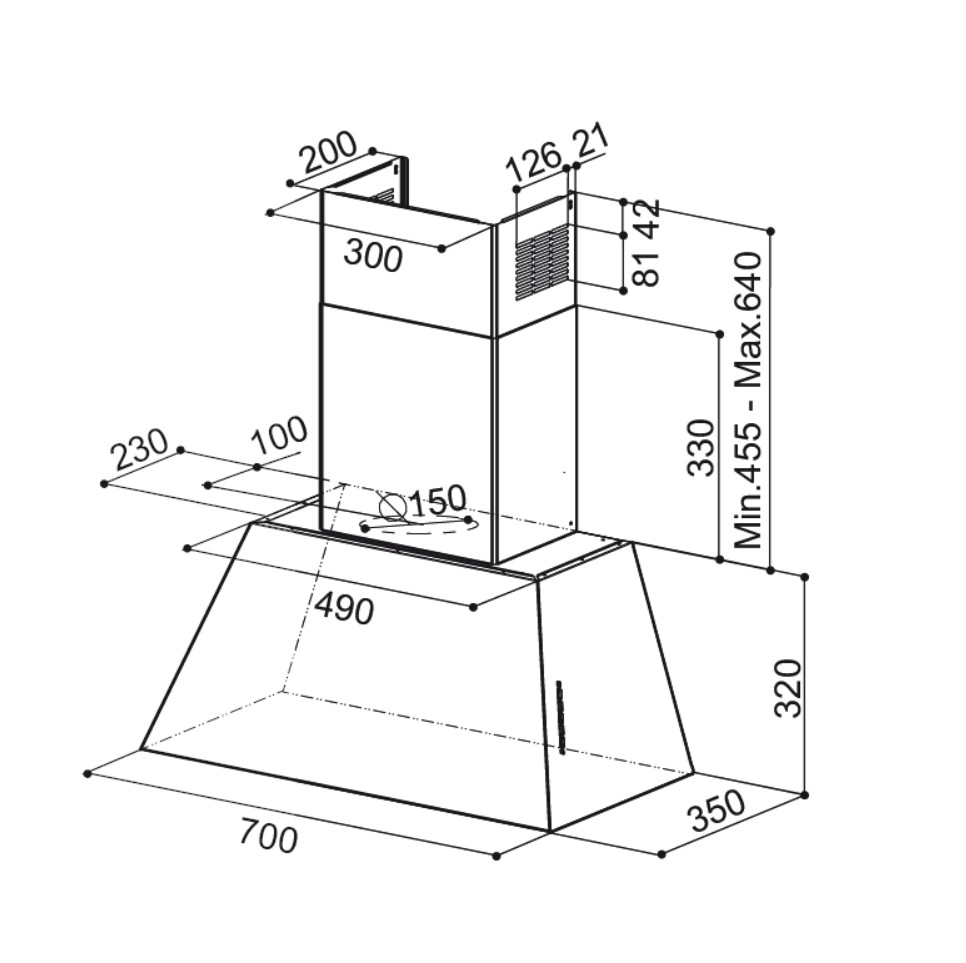 - Tyylikäs messinkinen liesituuletin sisäisellä moottorilla – vain 35 cm syvä ja mahdollisuus taaksepäin suuntautuvaan poistoon.