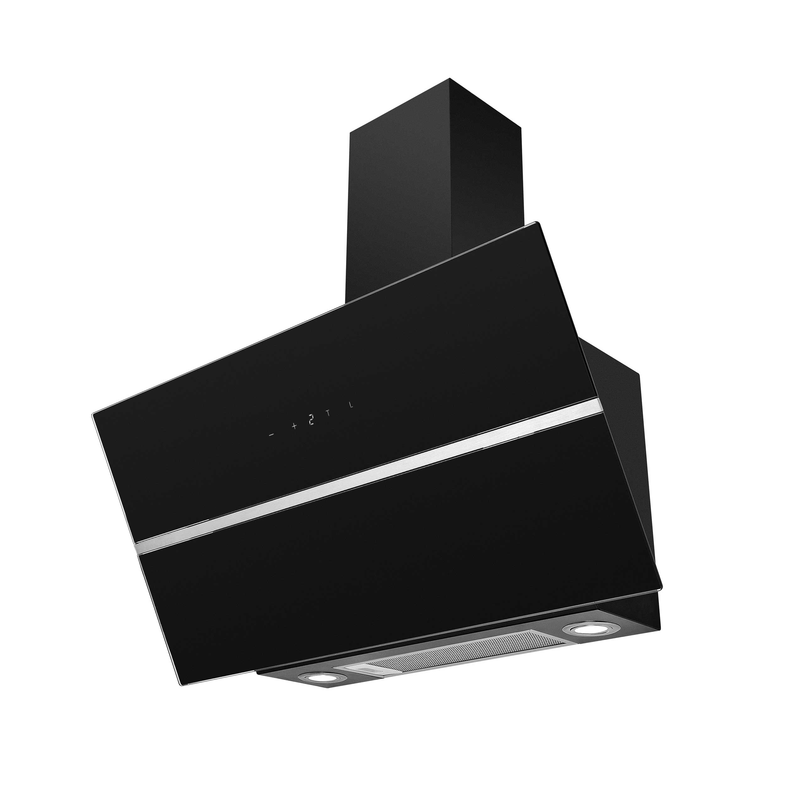 Seinään asennettava liesikupu, Viistomallinen, Mukana sisäasennukseen tarkoitettu ulkoinen moottori - Musta/Musta lasi/ruostumaton teräslista - 800 mm