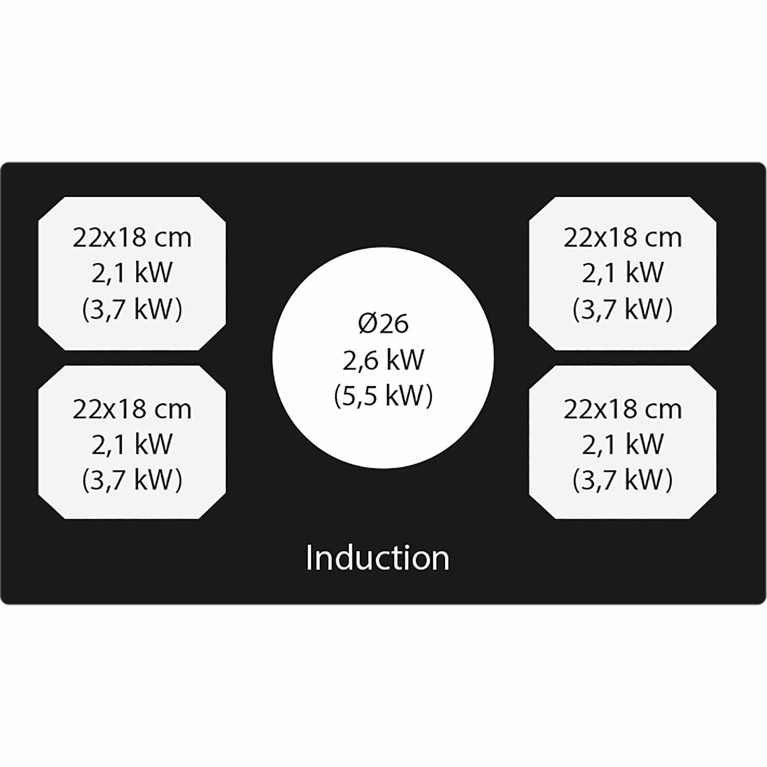 Molemmilla puolilla etu- ja takakeittoalue voidaan yhdistää yhdeksi suureksi keittoalueeksi (22x36 cm)