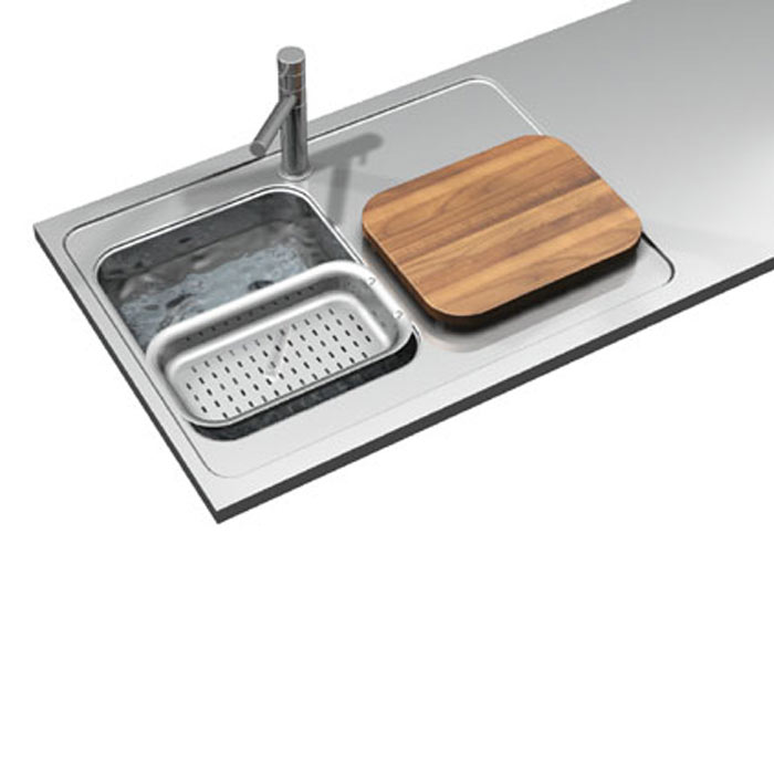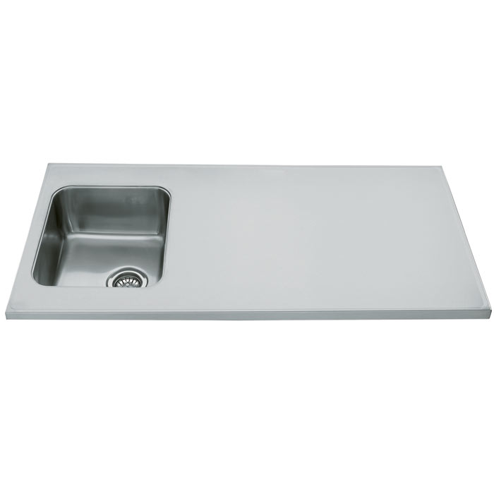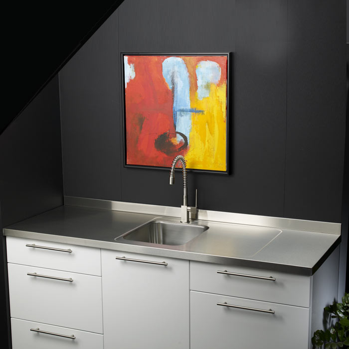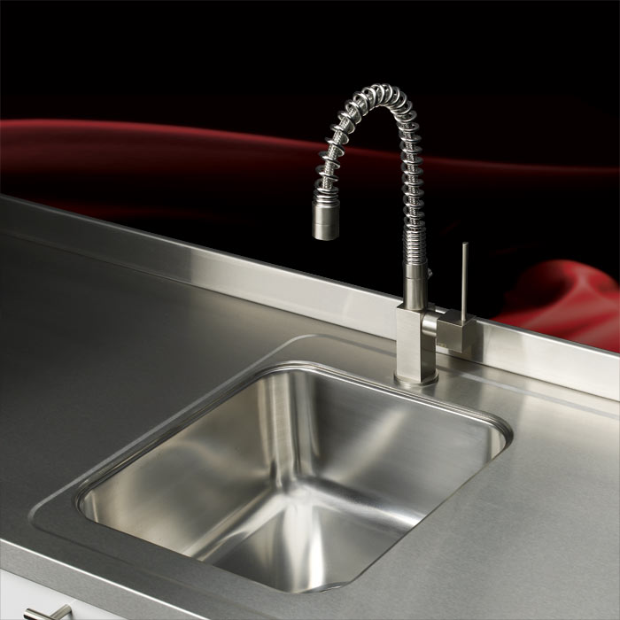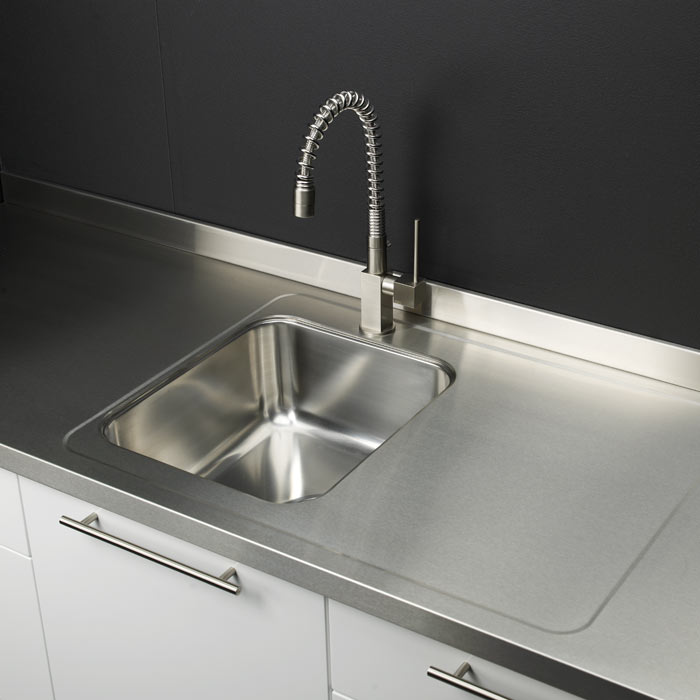 Seven C, Stålbordplade med kumme. Stålbordplade med enkelt kumme. Bordpladens længde kan vælges med en halv centimeters interval. Plan eller ophøjet kantprofil. Overfladen er som standard glat. Dekomønster kan bestilles separat. løft-up ventil kan bestilles. Stålbagkant kan leveres til montering Kanten er 58 mm høj. Hanehul kan bestilles